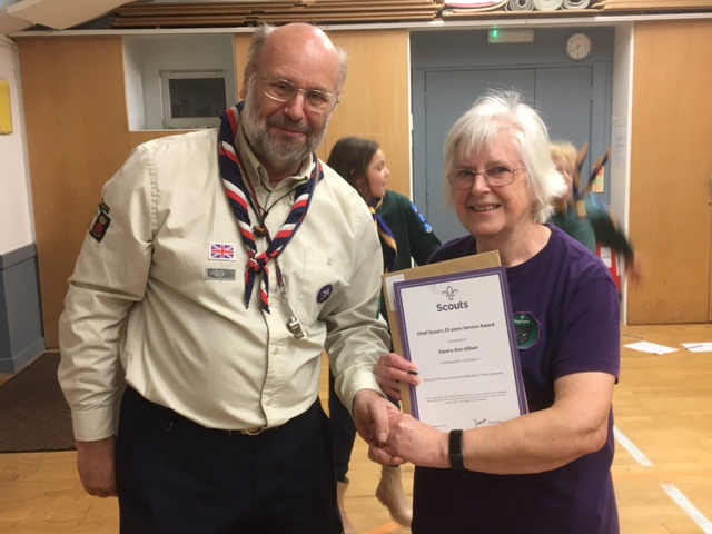 Tim Le Bas attended a recent 3rd Ringwood Cubs meeting to present Ann Gillam with her Chief Scout’s 25 years Service Award. Almost a fixture at 3rd Ringwood – Ann’s service actually goes back to ‘a time before records began’!