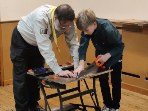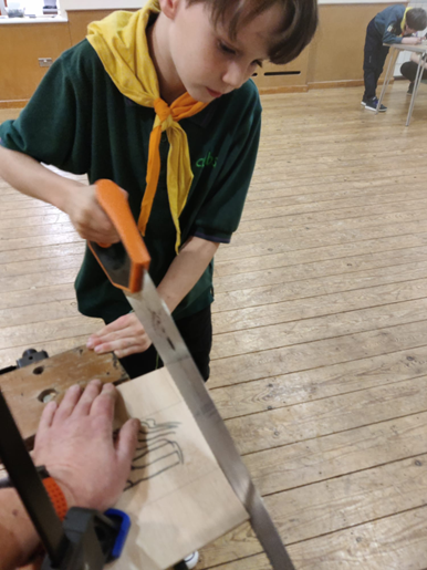 So this half term, Lyndhurst Scouts have been building individual race cars. Each scout was given a pre-sawn rectangle of 3.6mm ply board. They had to mark up the board so they could saw & cut out two rectangles to insert the upcycled cans they had collected.